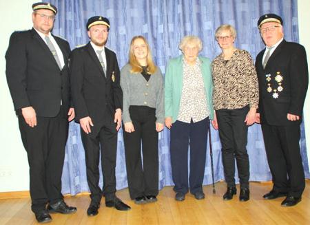 Das Foto zeigt von Links: Sebastian Otto (1. Vorsitzender), amtierendes Königspaar Robert Wendt und Elena Hoppe, Marianne Hoppe (75-jährige Jubelkönigin) und das 40-jährige Jubelkönigspaar Brunhilde und Martin Wendt